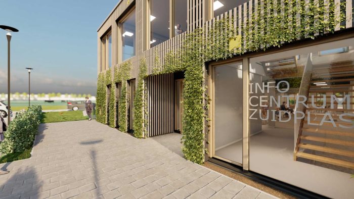 Het ontwerp voor het tijdelijke informatiecentrum van het vijfde dorp in Zuidplas is onderscheidend door een optimale balans tussen functionaliteit, sfeer en aansluiting op de omgeving.