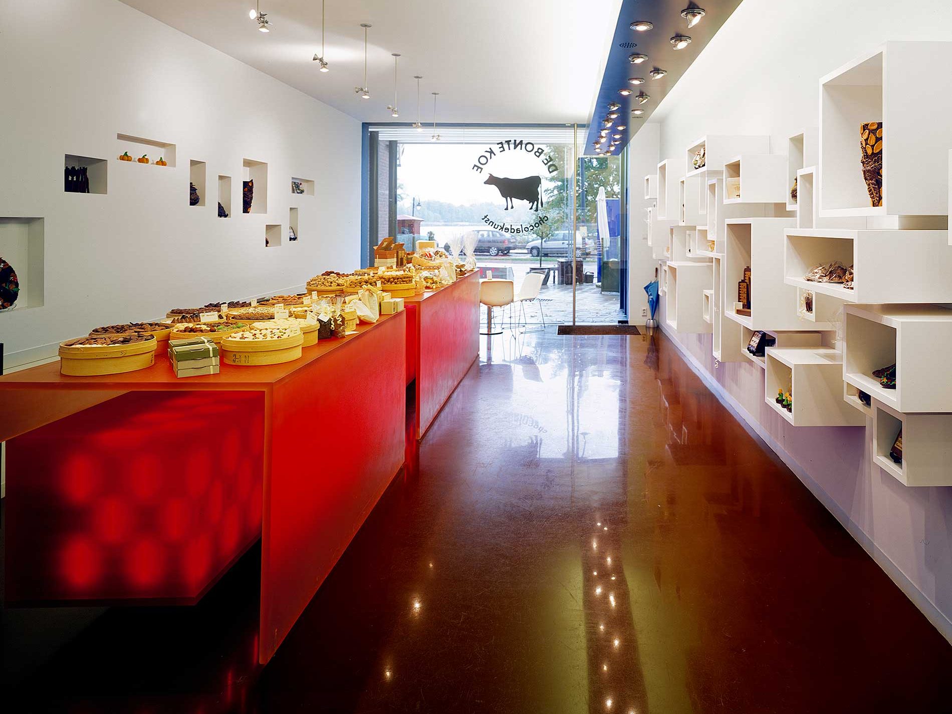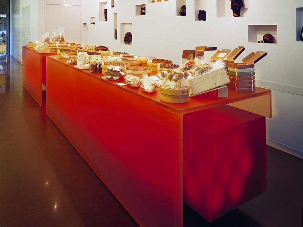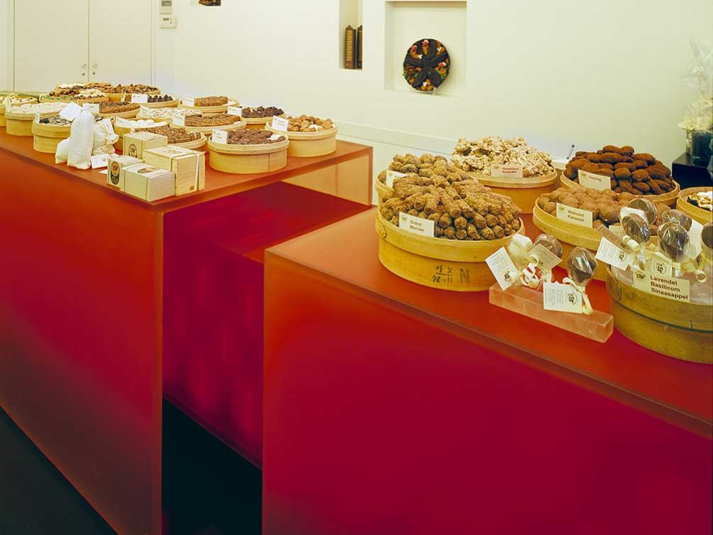 ‘Openheid’, een wens van de opdrachtgever, is een van de uitgangspunten geweest bij het ontwerp van de toonbank; alle producten liggen als het ware voor het grijpen. De toonbank is van binnenuit verlicht om de begeerte die chocolade oproept, te benadrukken. De dieprode binnenkast bevat de weekvoorraad chocoladeproducten.