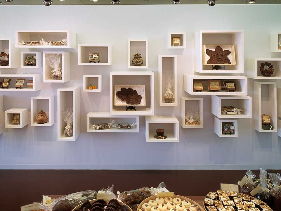 De exclusiviteit van de ‘chocoladekunst’ was aanleiding om de winkel als een galerie vorm te geven. Vanwege de tweezijdige winkelentree zijn de gevelpuien geheel in glas uitgevoerd waardoor de relatie tussen het winkelinterieur en de omgeving volledig tot uitdrukking komt.