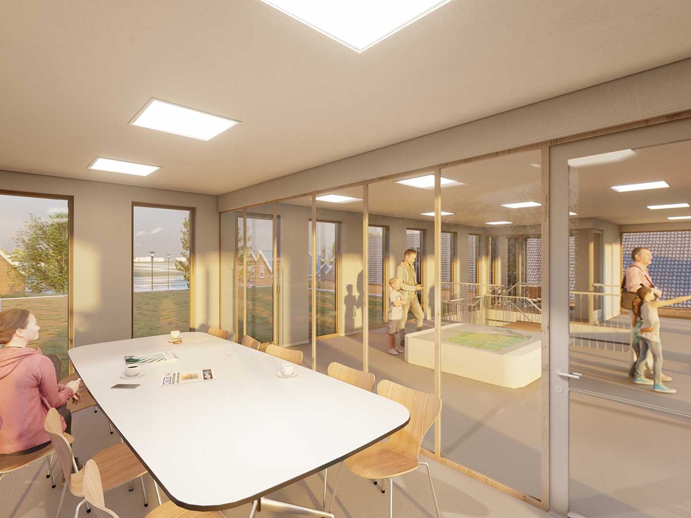 Aan de noordwestzijde van het informatiecentrum liggen twee middelgrote overlegruimtes die kunnen worden gecombineerd tot één grote overlegruimte door middel van een schuifwand. Aan de zuidwestzijde van het informatiecentrum ligt een 3 meter brede servicestrook die de secundaire ruimten bevat die direct worden ontsloten vanuit de algemene functionele ruimte. Door een verdieping aan het gebouw toe te voegen, wordt ook het duurzame karakter van het informatiecentrum nog beter zichtbaar in de vorm van een circulair groendak met sedum, grassen en kruiden, en met PV-panelen. Vanaf de verdieping heeft men rondom uitzicht op het omringende landschap. Hier bevindt zich een open ruimte, waar bijvoorbeeld een overzichtsmaquette van het Vijfde Dorp kan worden geplaatst, en twee kleine overlegruimten voor respectievelijk 4 en 8 personen.