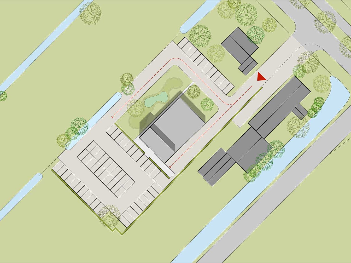 Het buitenterrein wordt zo ingericht dat aan de noordoostzijde van het gebouw de autoweg via een brede groenstrook wordt gescheiden van het informatiecentrum. Hier komen geen parkeerplaatsen zodat de relatie van de binnen- en buitenruimte versterkt en er optimaal zicht is op de ontwikkeling. Het autoparkeren wordt als half-verharding uitgevoerd zodat hemelwater meteen in de ondergrond opgenomen kan worden. Bovendien wordt het parkeren zoveel mogelijk aan het zicht onttrokken middels een hoge haag.