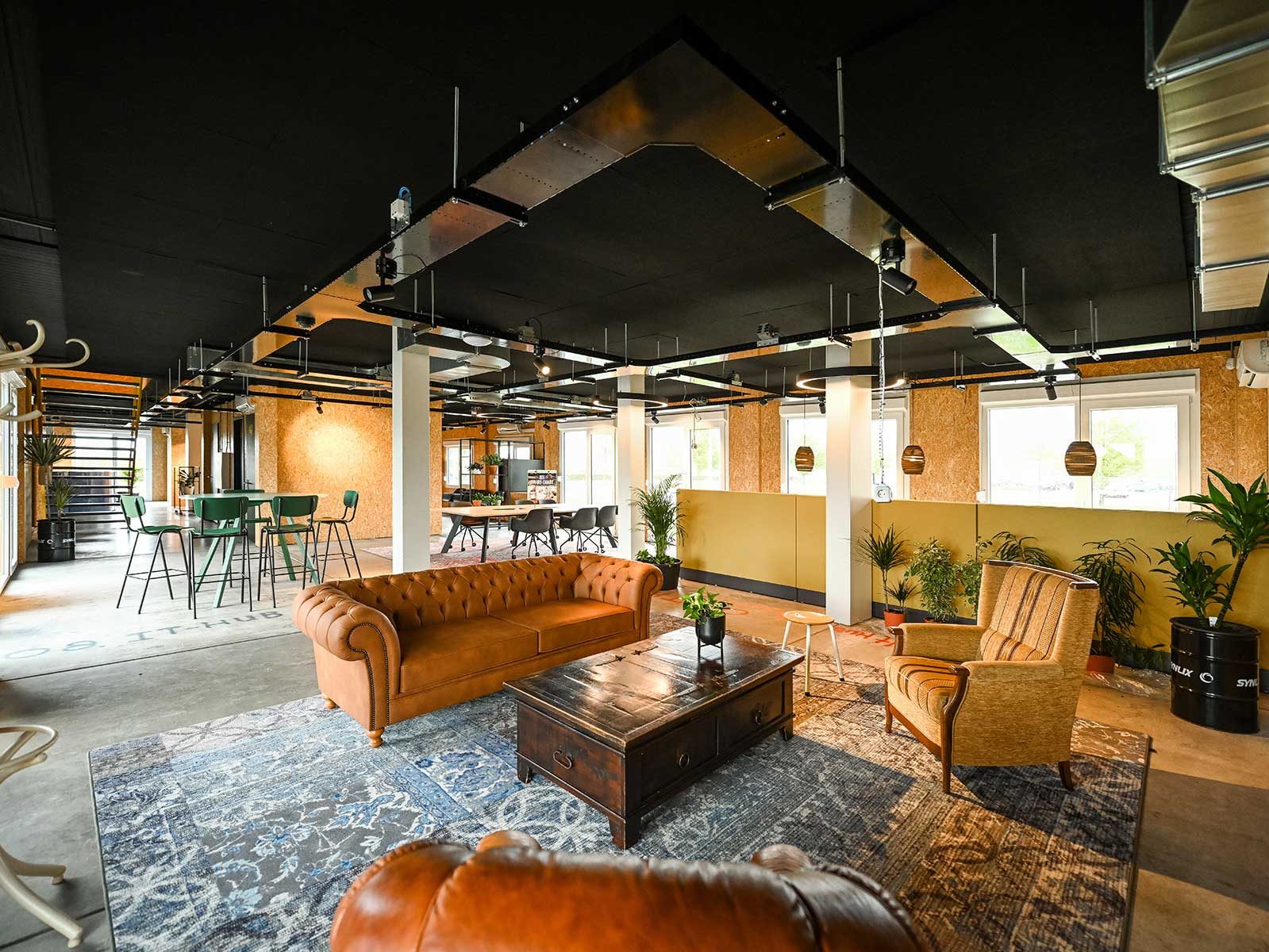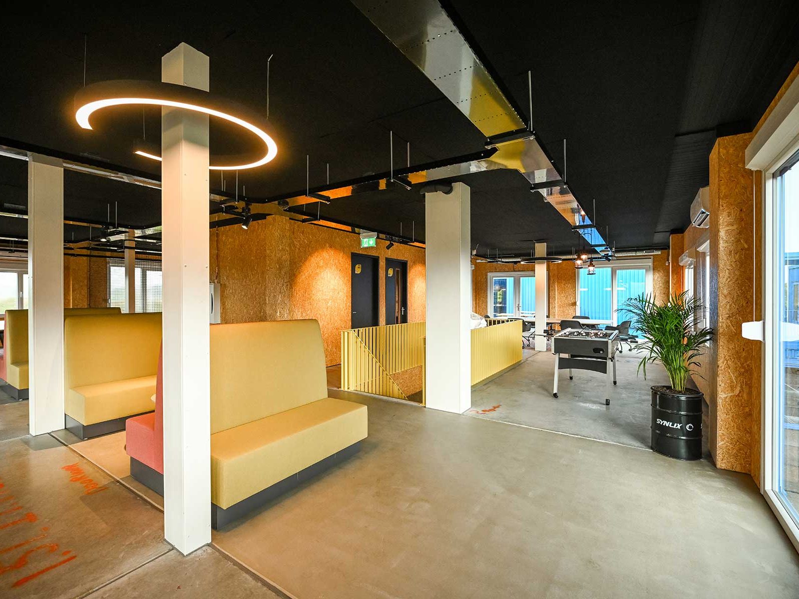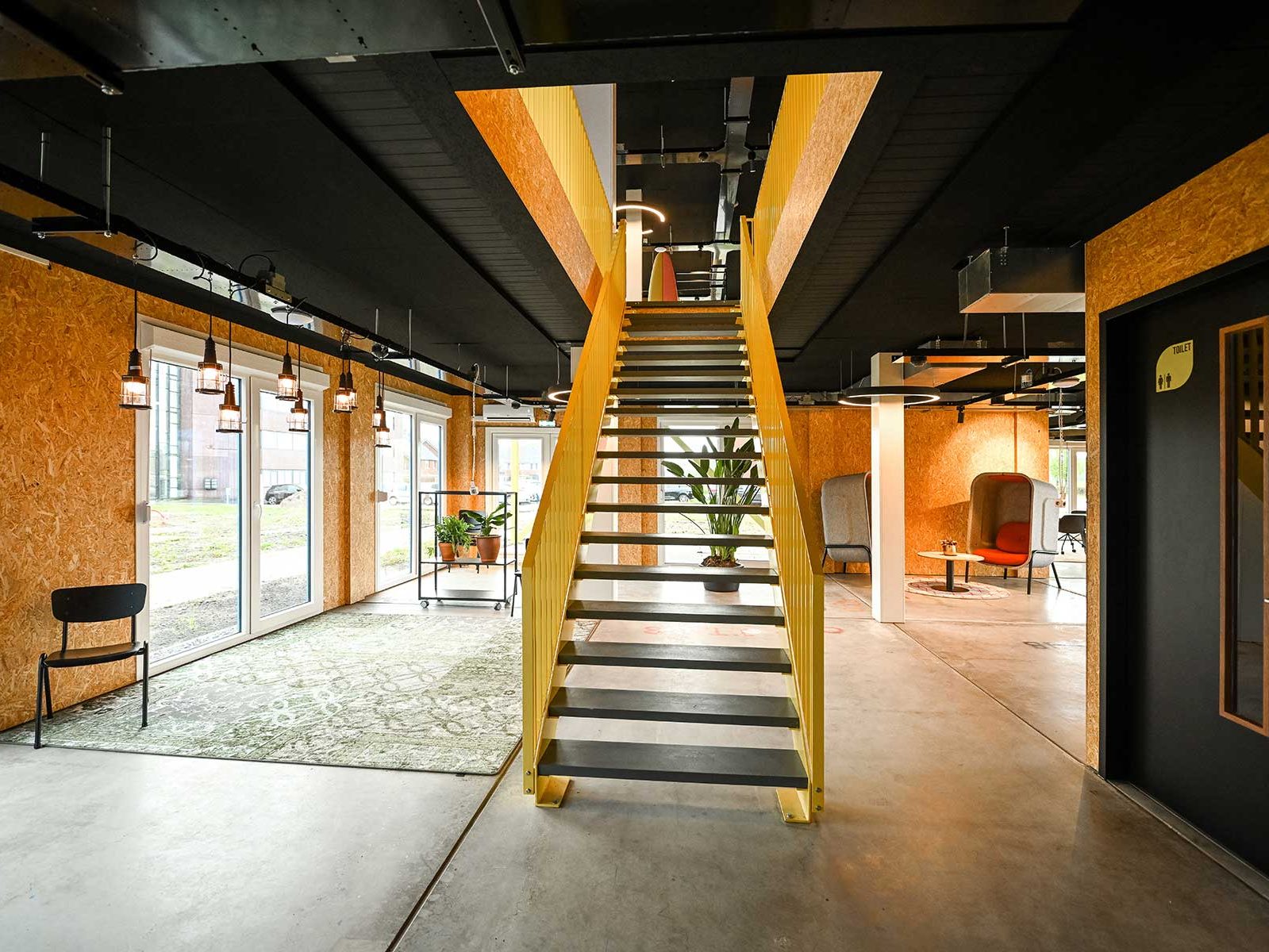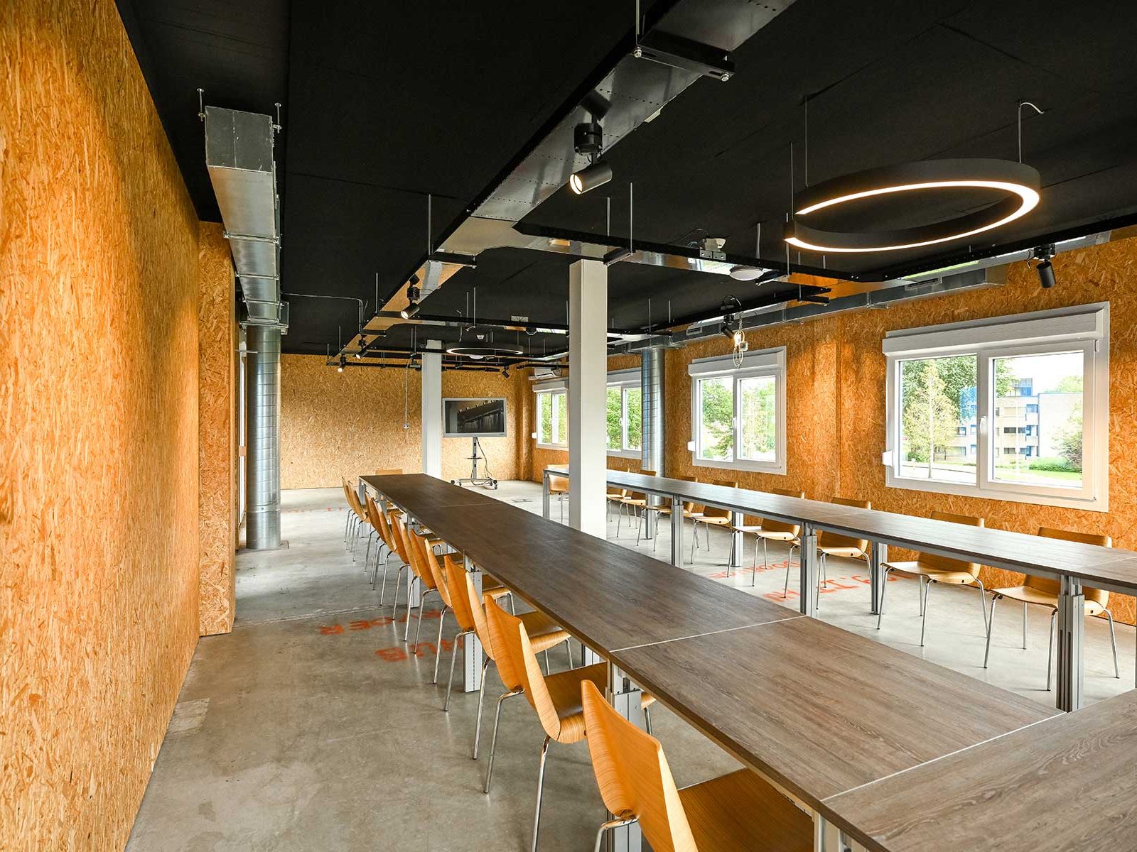 Het interieur is bewust juist heel sober en industrieel uitgevoerd waardoor het materiaalgebruik sterk is teruggedrongen. De betonvloeren zijn onafgewerkt, de wanden zijn bekleed met blank gelakte OSB-platen en de plafonds zijn uitgevoerd in zwarte akoestische platen om zo ook het geluidcomfort binnen in het gebouw te optimaliseren. Alle installaties blijven in het zicht. De luchtbandelingskanalen en vrij hangende elektragoten zijn zorgvuldig gemaatvoerd zodat deze onderdelen visueel niet storend zijn. Er is gekozen voor multi-inzetbare ruimtes die voor meerdere doeleinden gebruikt kunnen worden.