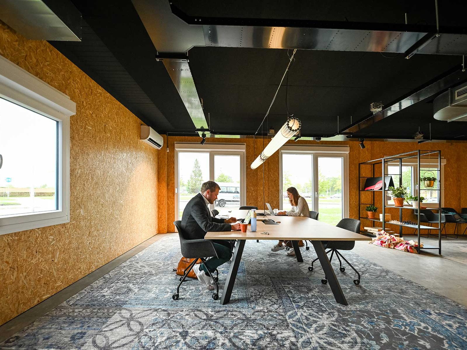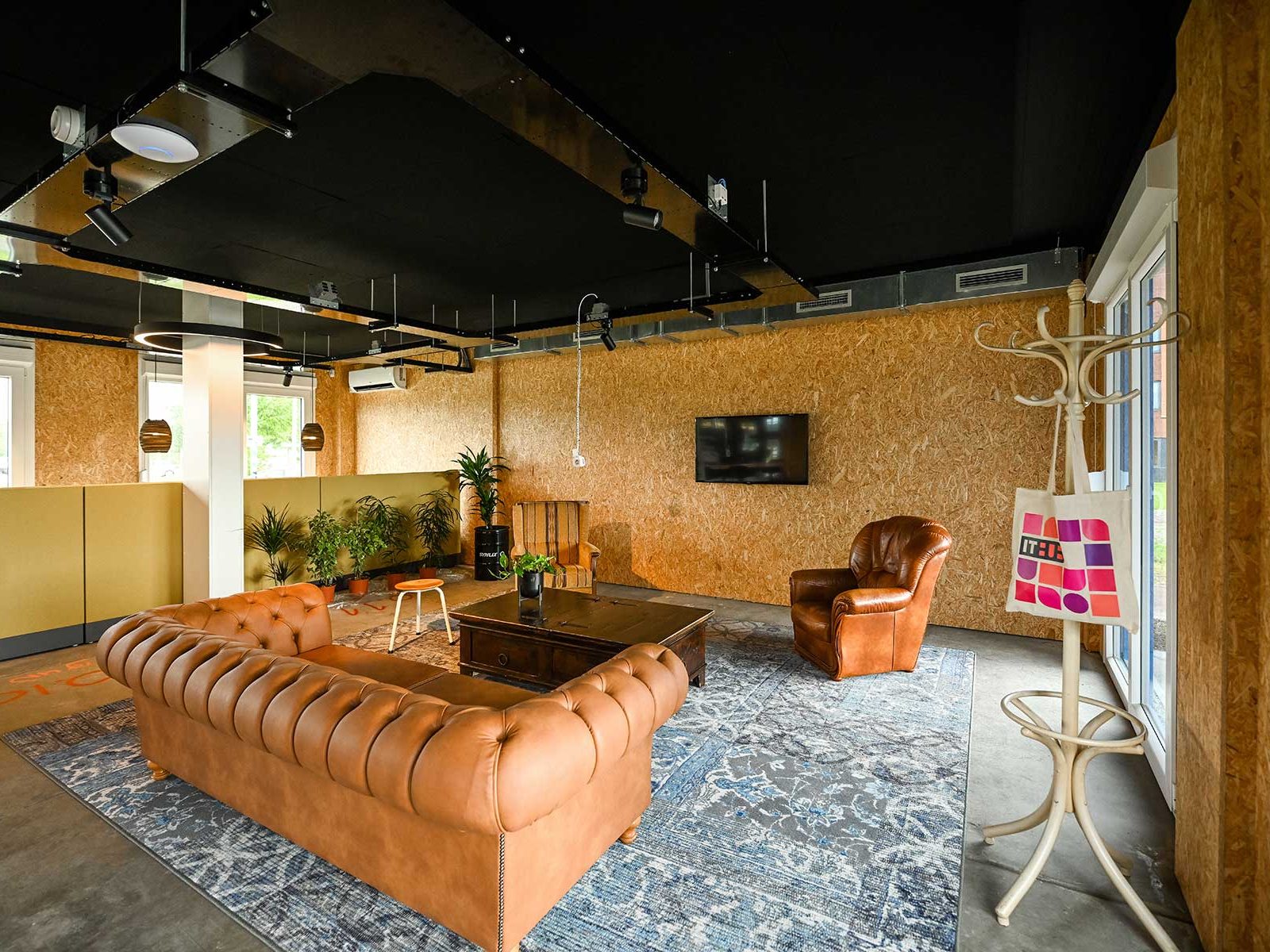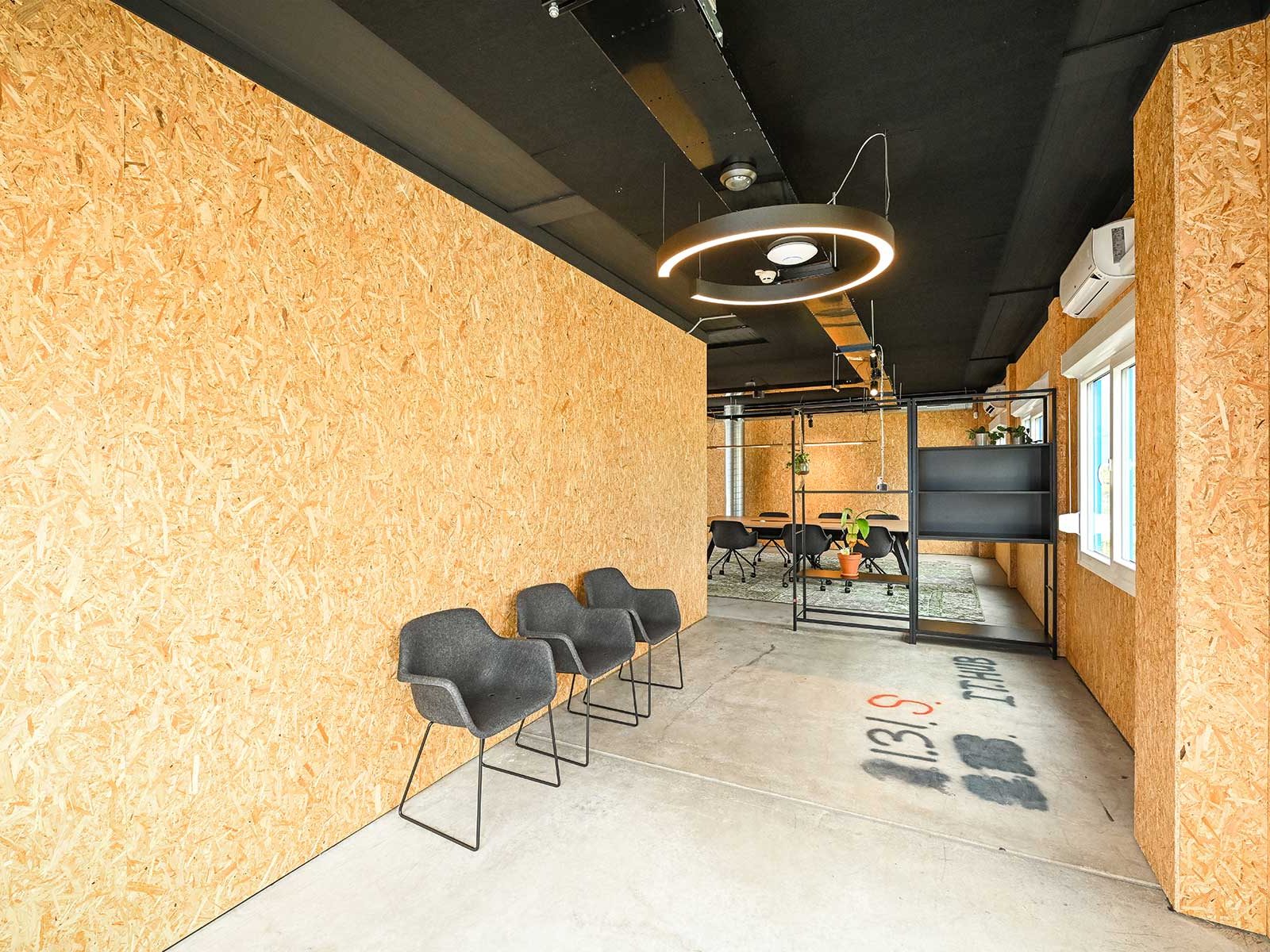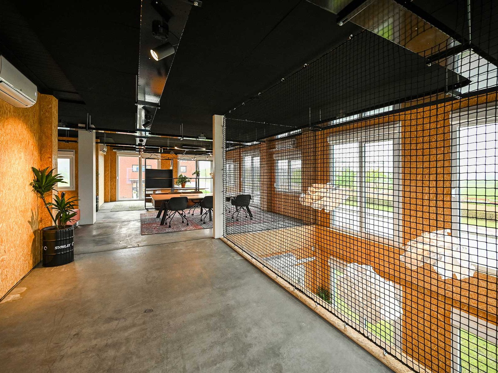 Het interieur is bewust juist heel sober en industrieel uitgevoerd waardoor het materiaalgebruik sterk is teruggedrongen. De betonvloeren zijn onafgewerkt, de wanden zijn bekleed met blank gelakte OSB-platen en de plafonds zijn uitgevoerd in zwarte akoestische platen om zo ook het geluidcomfort binnen in het gebouw te optimaliseren. Alle installaties blijven in het zicht. De luchtbandelingskanalen en vrij hangende elektragoten zijn zorgvuldig gemaatvoerd zodat deze onderdelen visueel niet storend zijn. Er is gekozen voor multi-inzetbare ruimtes die voor meerdere doeleinden gebruikt kunnen worden.