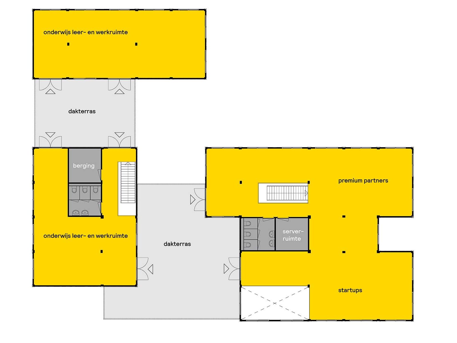 Het concept van ontmoeting is in functionele en ruimtelijke zin vertaald door drie verschillende gebouwdelen te ontwerpen voor onderwijs, bedrijfsleven en startups, die in de ontmoeting hun samenwerking vinden. Dit heeft geleid tot een spectaculair en compromisloos gebouw bestaande uit een grote, continue ruimte waar à la minute verschillende studie- en werkplekken kunnen worden gecreëerd.
