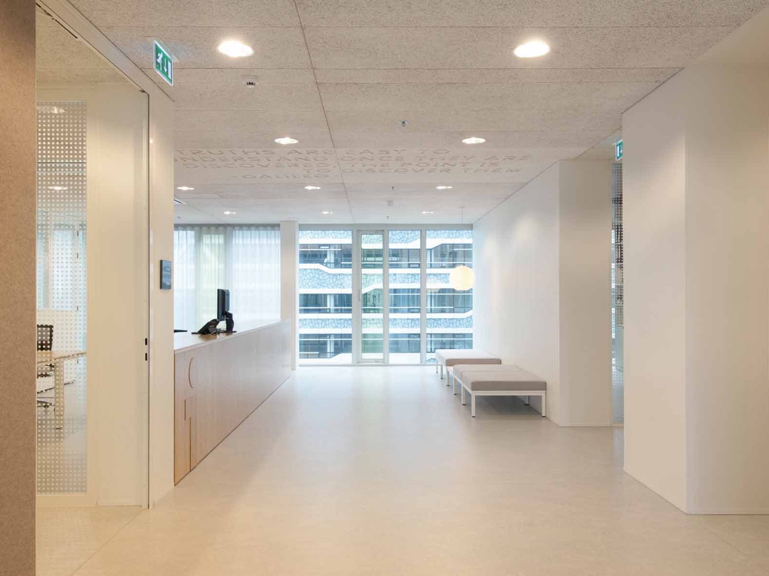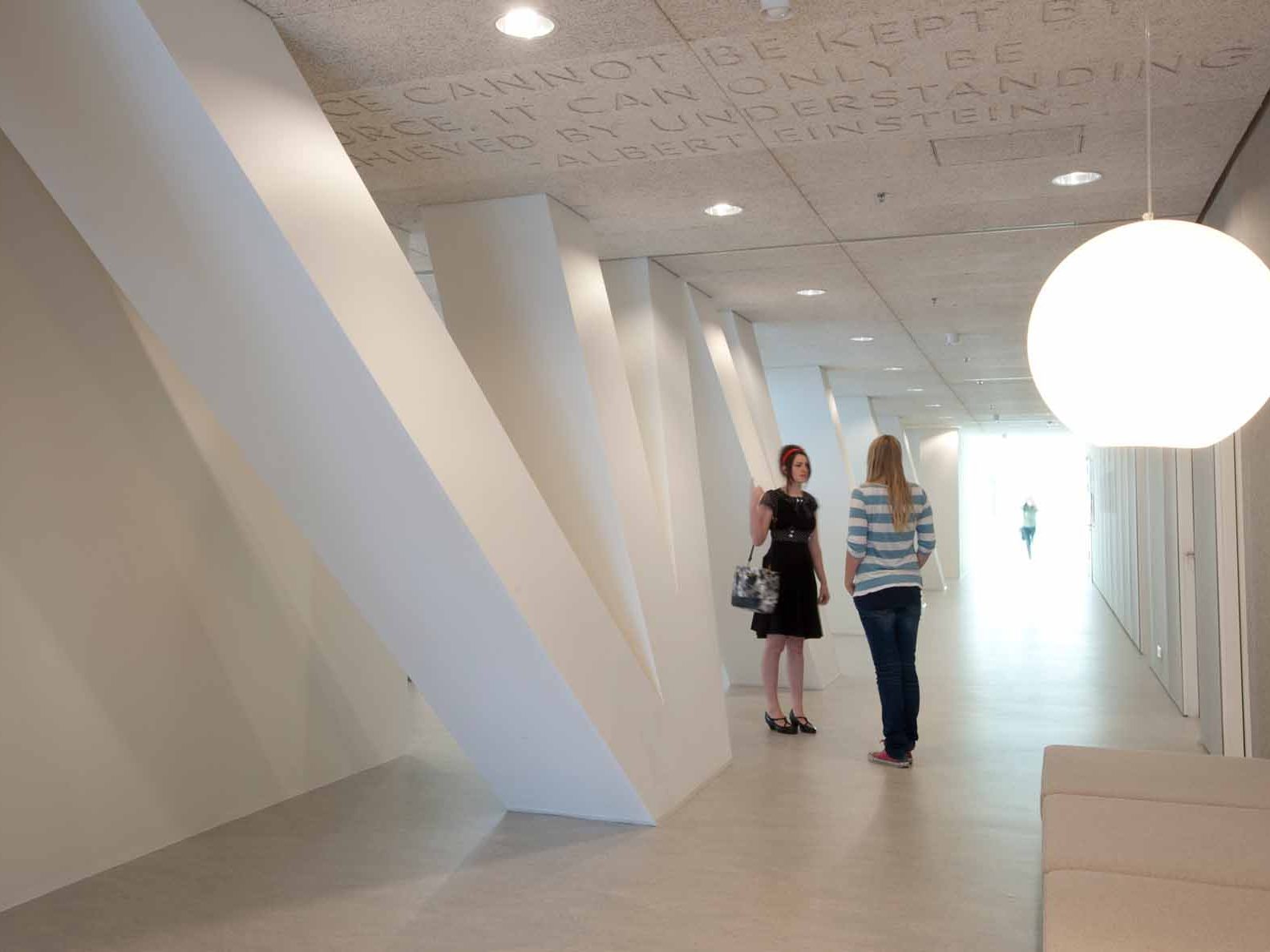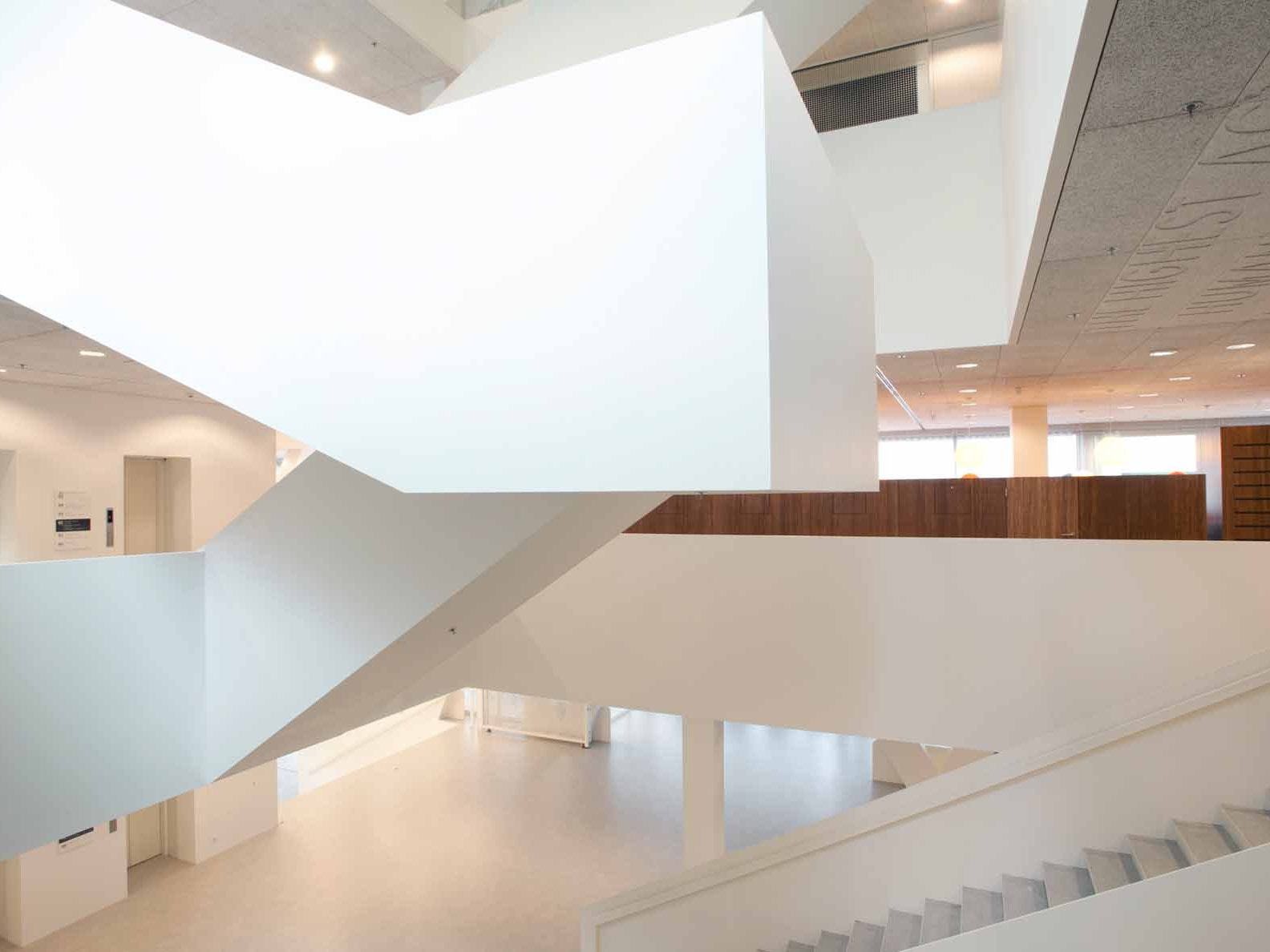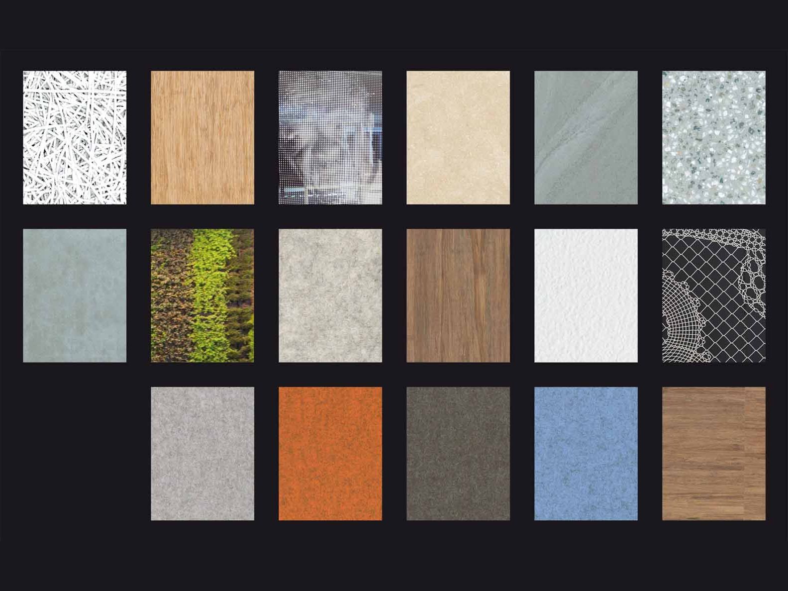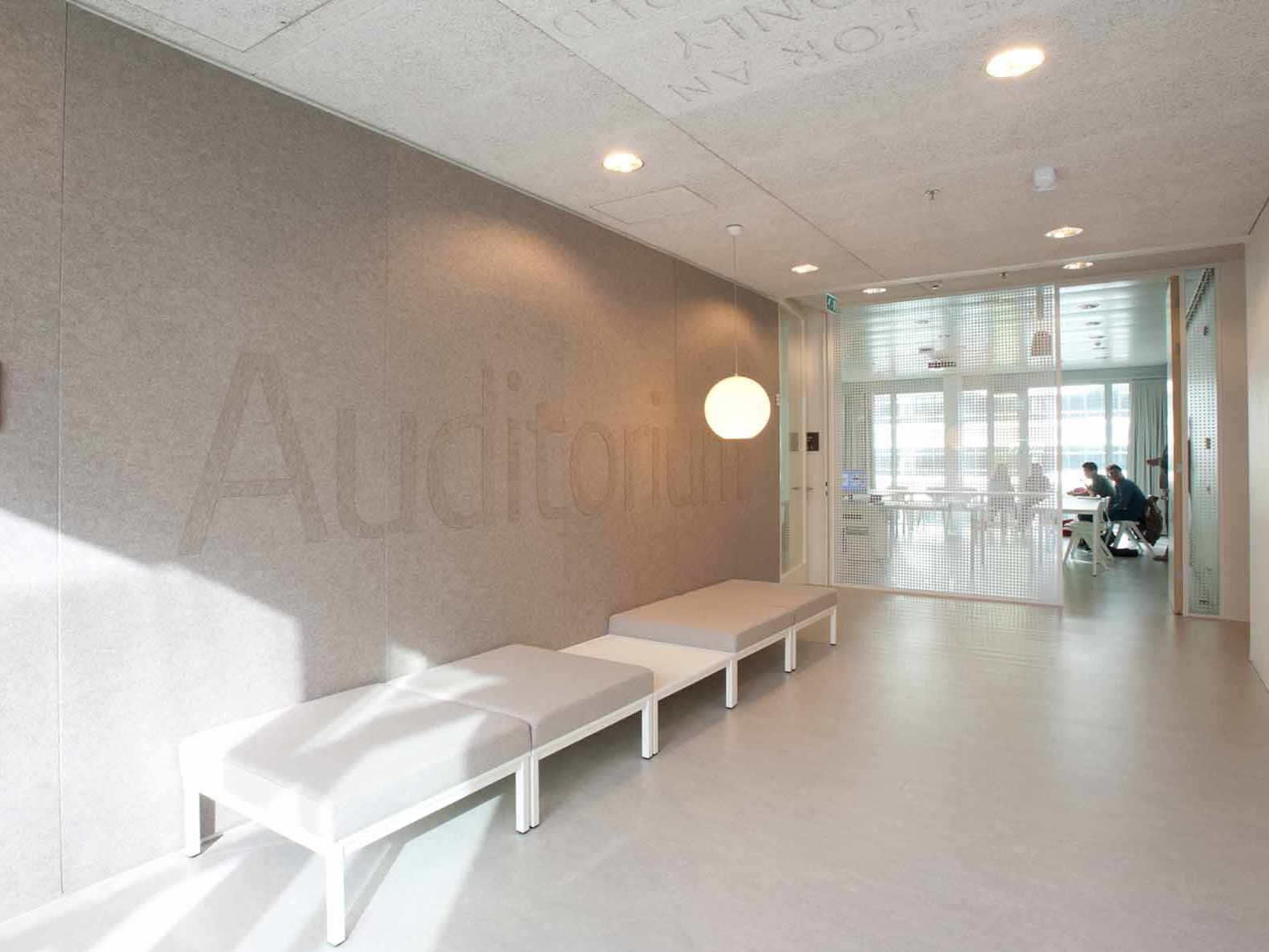 Vanuit het neutrale witte casco van Wiel Arets Architects worden er materiaalaccenten gelegd op vloeren, wanden, plafonds, meubels en verlichting. Door voor deze accenten te kiezen voor duurzame materialen wordt duurzaamheid zichtbaar en wordt een visuele en tactiele verbijzondering aan ruimtes meegegeven waardoor sterke, unieke ruimtes met een duidelijke identiteit worden gecreëerd.