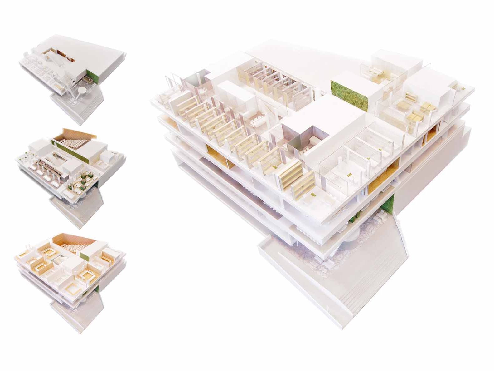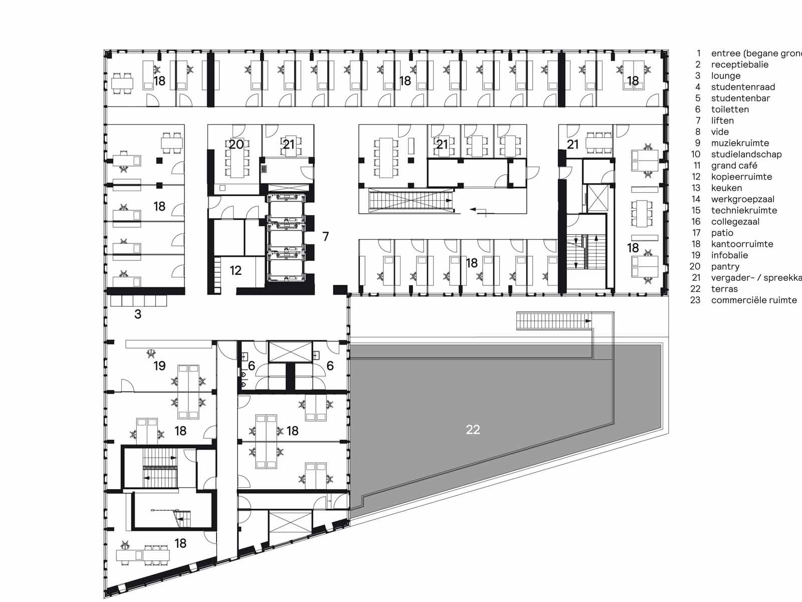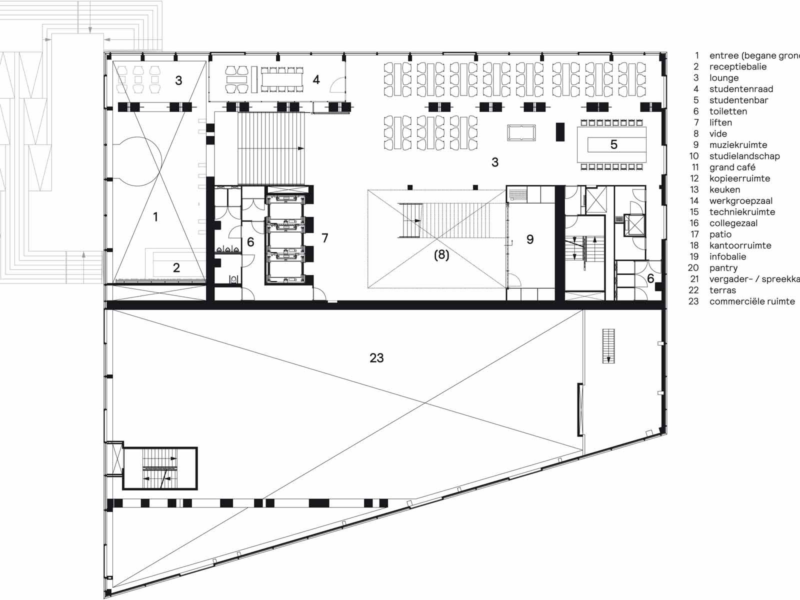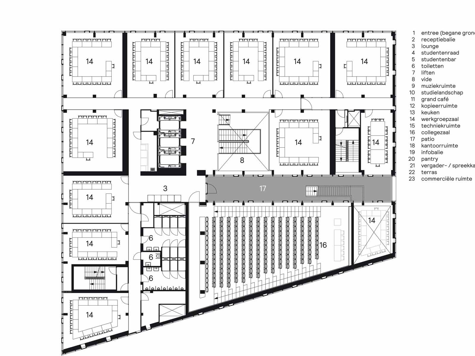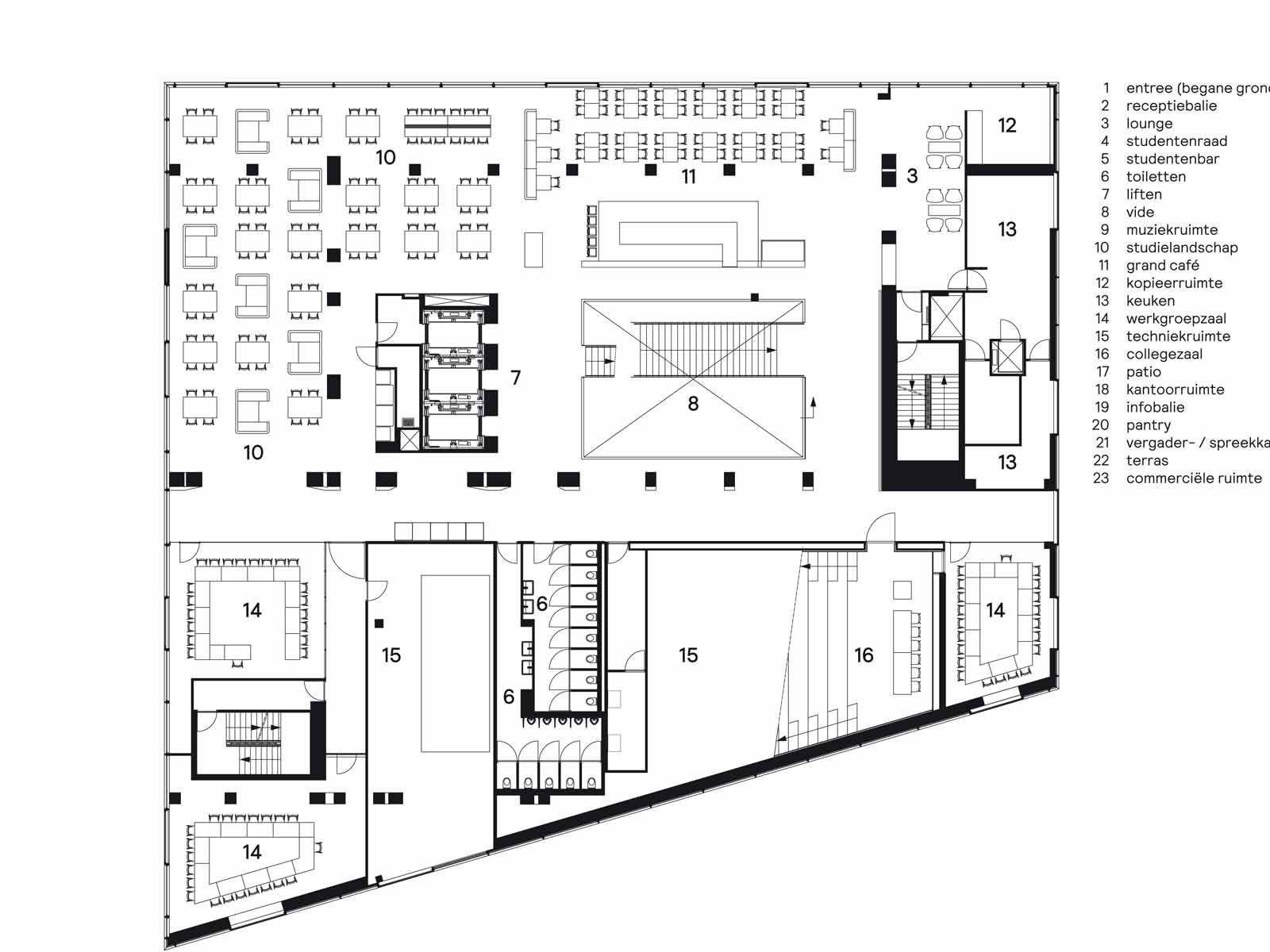 programma: onderwijsruimten, auditorium, grandcafé en kantoren
