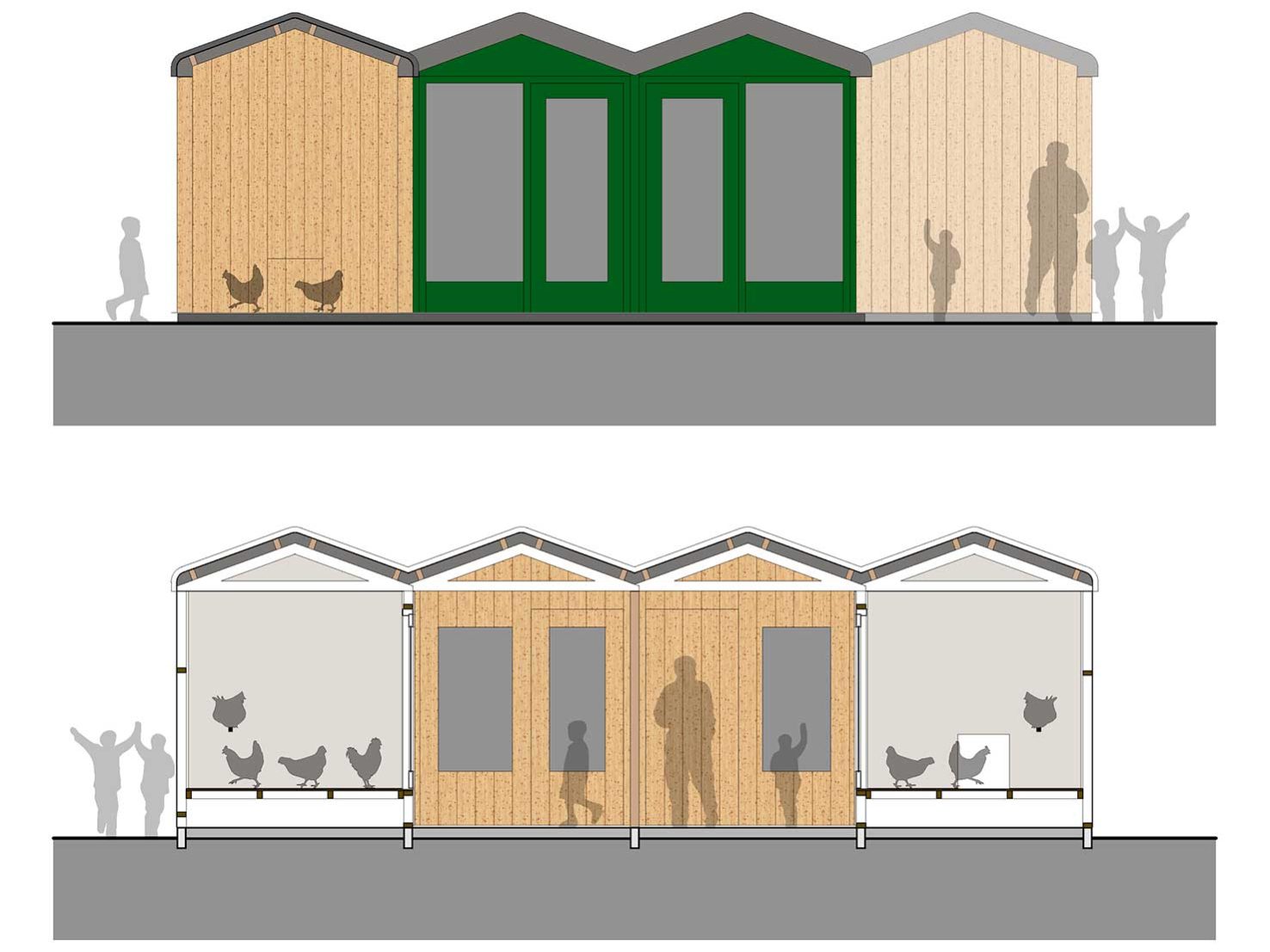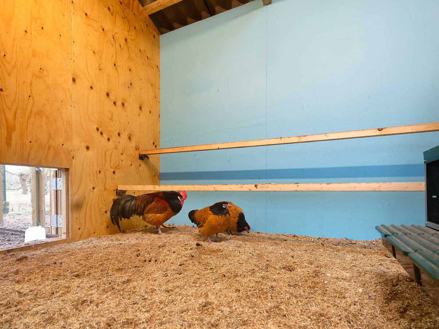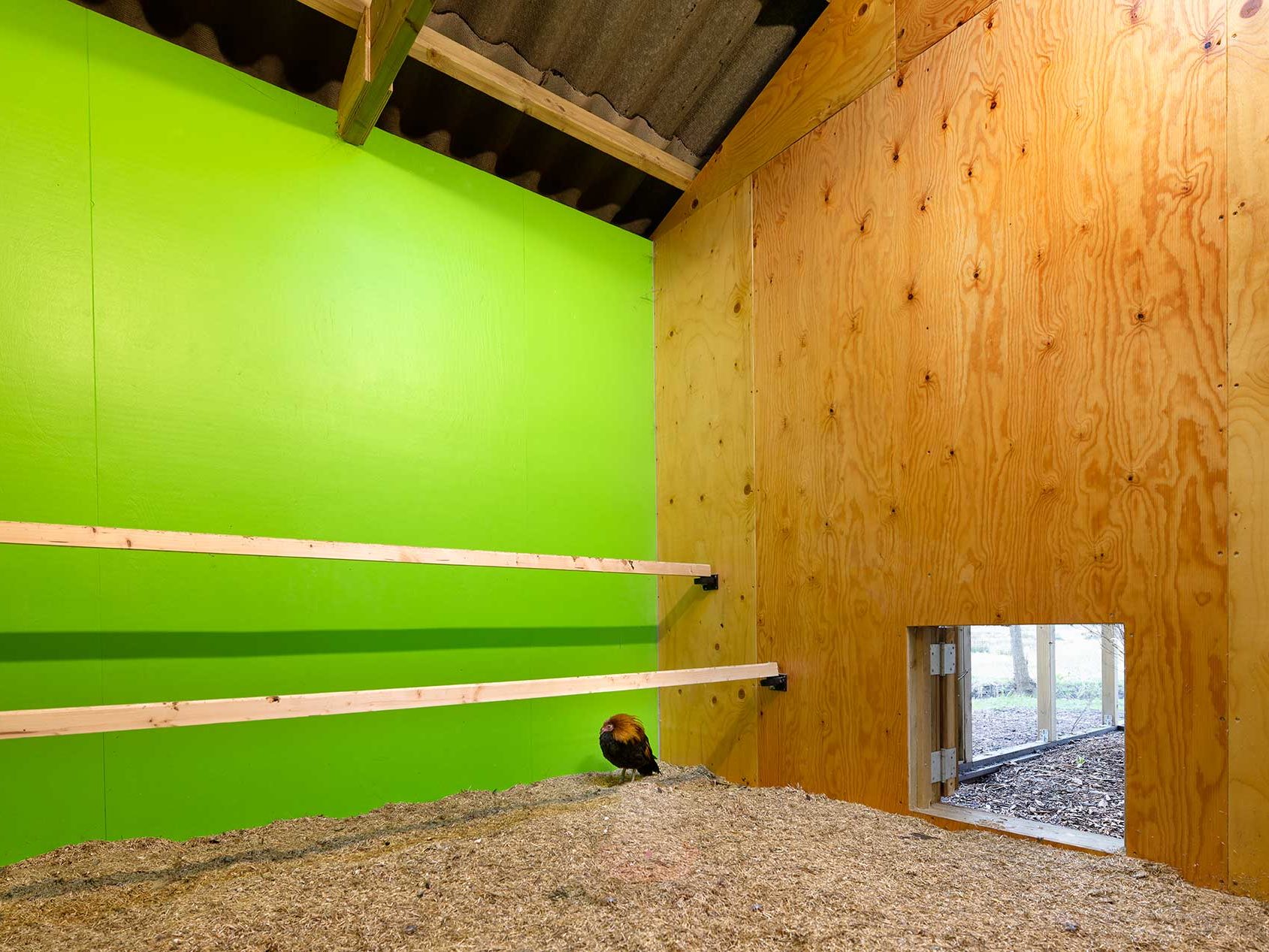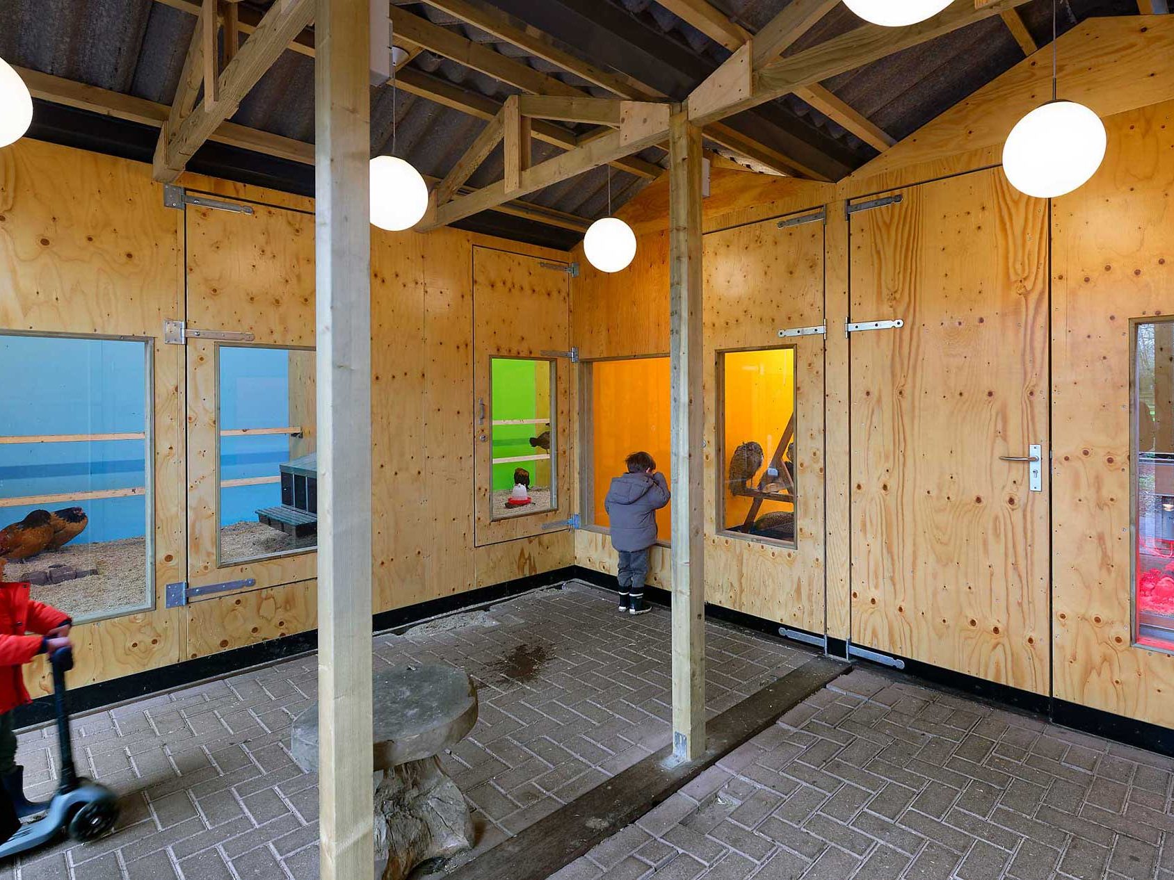 Er is voldoende ruimte binnen om een groep kinderen te ontvangen en vanuit deze binnenruimte bieden grote vensters een inkijk in elk afzonderlijk binnenhok. Bovendien zijn de vloeren van de kippenhokken verhoogd aangelegd zodat de kippen op kindhoogte zijn en de kinderen de kippen ‘in de ogen kunnen kijken’. Er is ruimte gemaakt voor een broedmachine die ook zichtbaar is vanuit de binnenruimte.