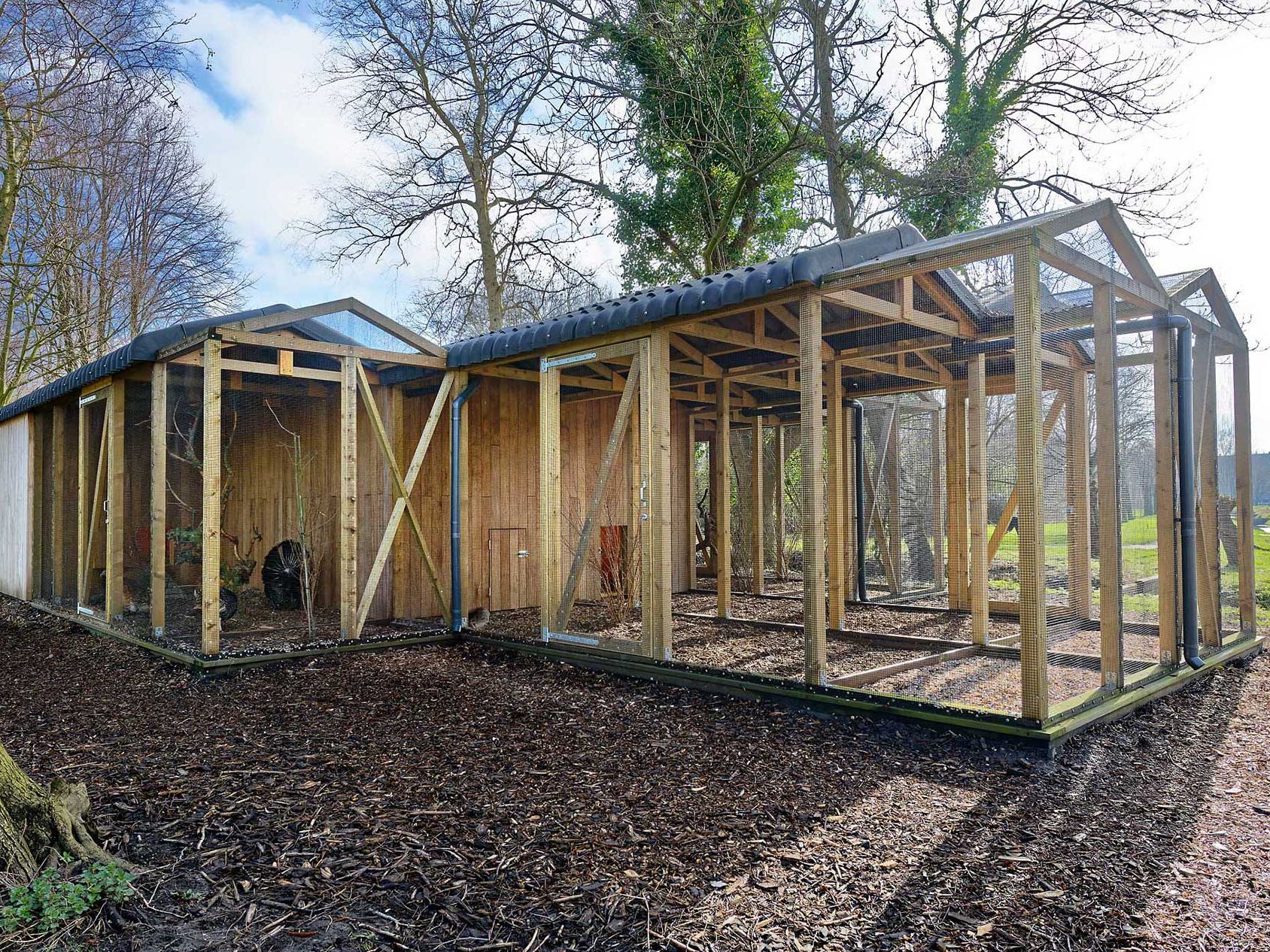 Binnen het ontwerp is uiteraard rekening gehouden met dierenwelzijn, elke ren heeft zowel een overkapt als een open gedeelte zodat het pluimvee af en toe in de regen kan lopen. Dit is noodzakelijk voor de kwaliteit van de veren.
