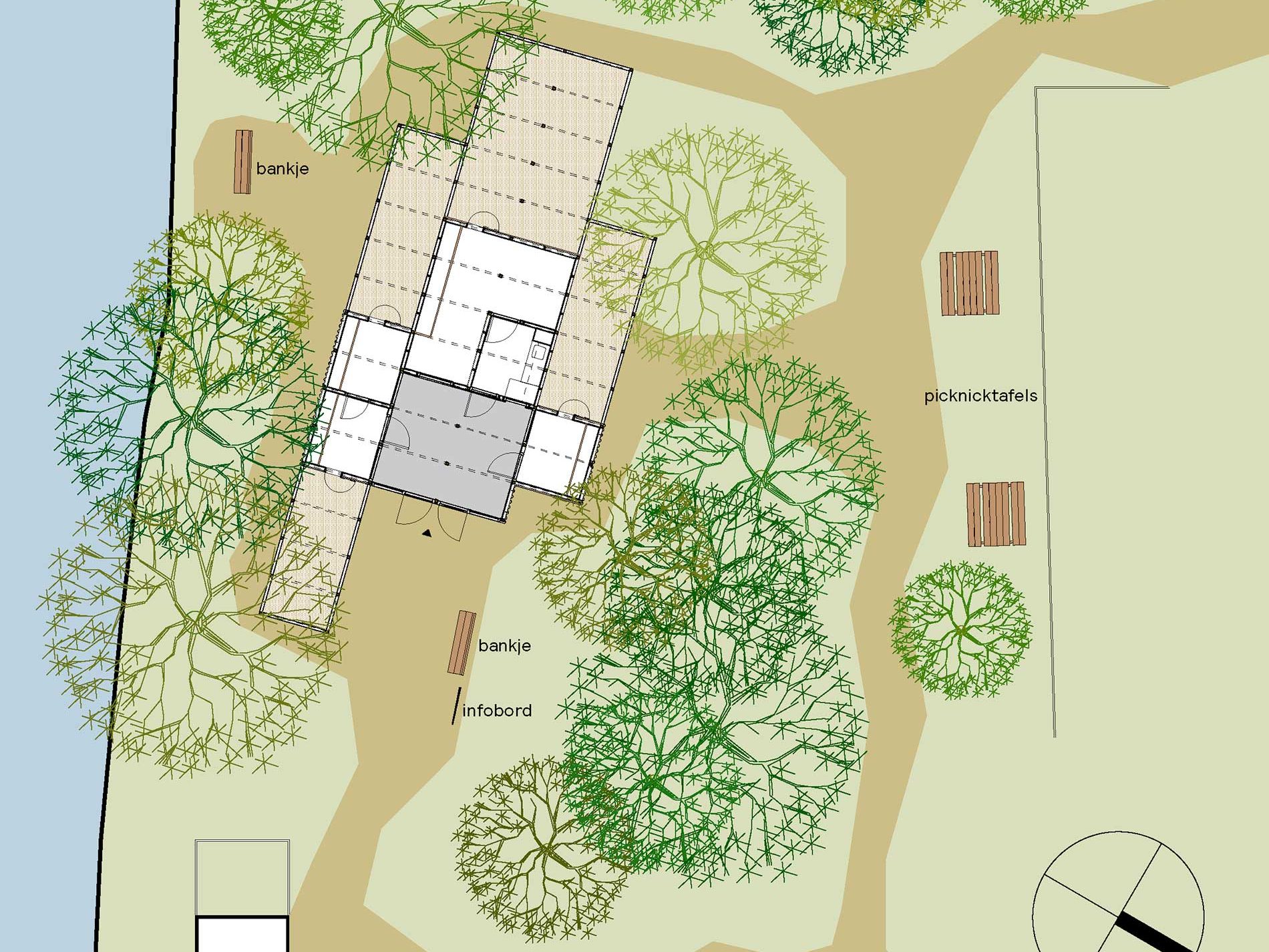 De verschillende dierverblijven en nevenfuncties liggen rondom de historische boerderij verspreid op het erf, met het nieuwe pluimveeverblijf in de meeste zuidelijke hoek van de locatie, in de directie nabijheid van het water.