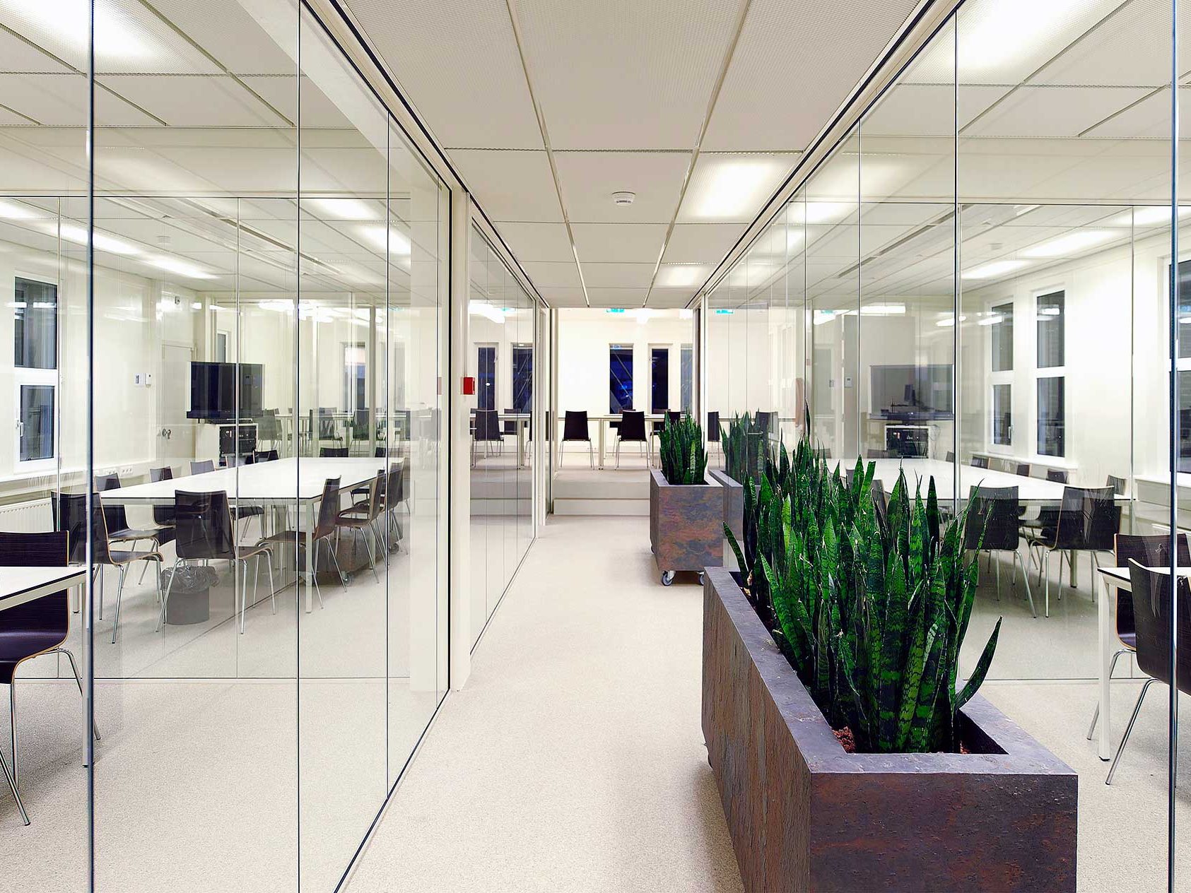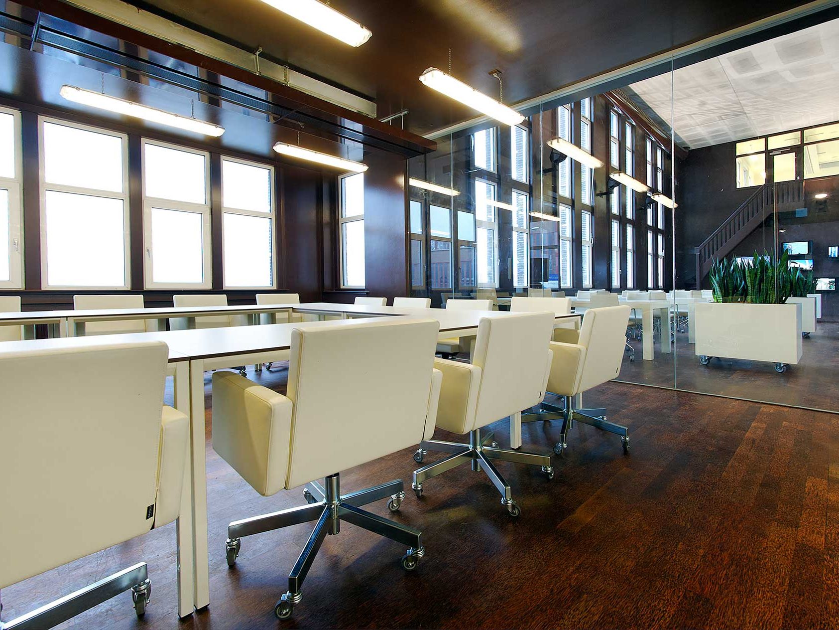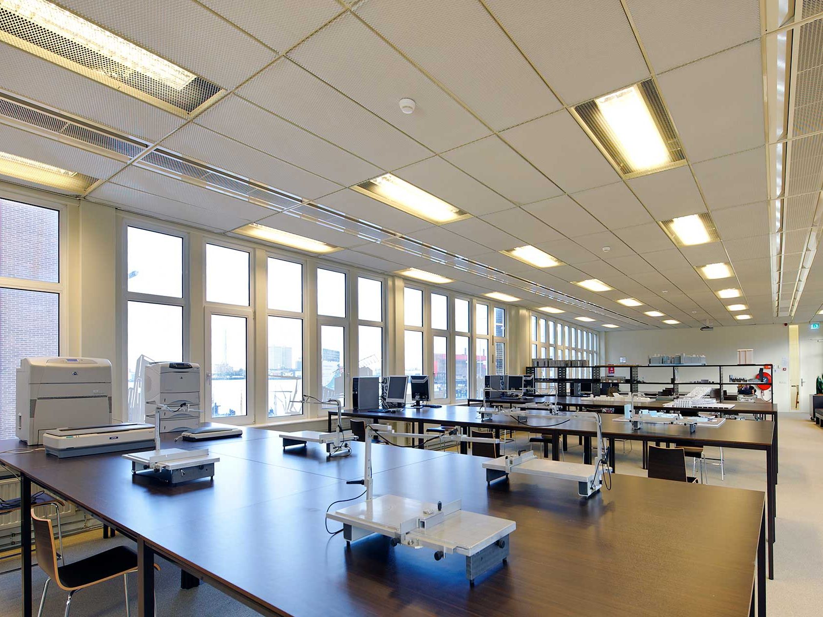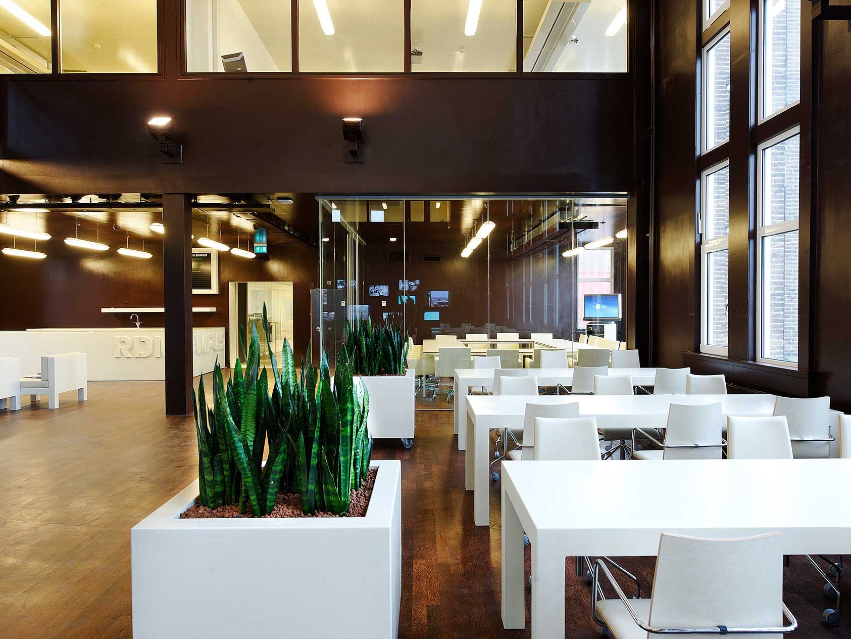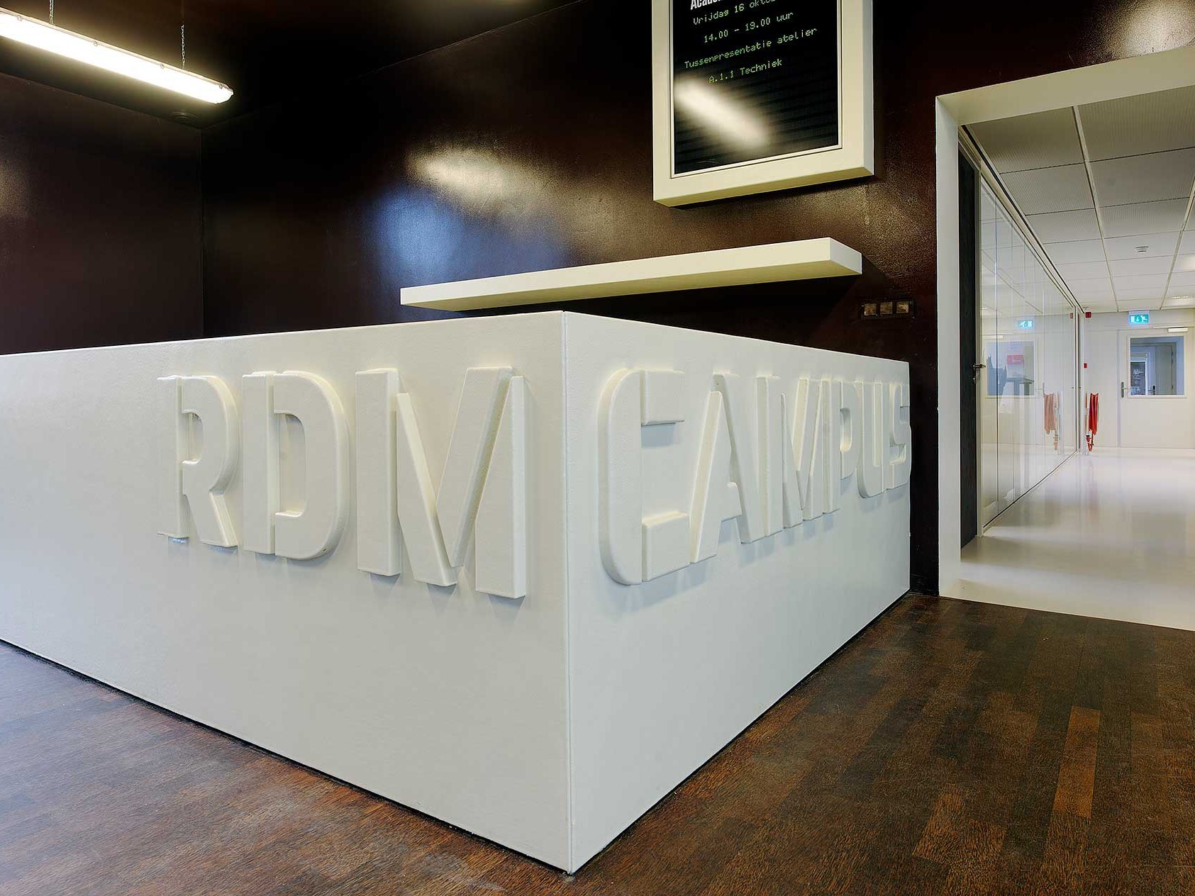 Door het gebruik van vernieuwende materialen, zoals akoestische Vectogramm plafonds en wanden, steenfineer-deuren, polyurethaan-meubelen en een palmhouten vloer wordt het innovatieve karakter van RDM Campus fysiek voelbaar.