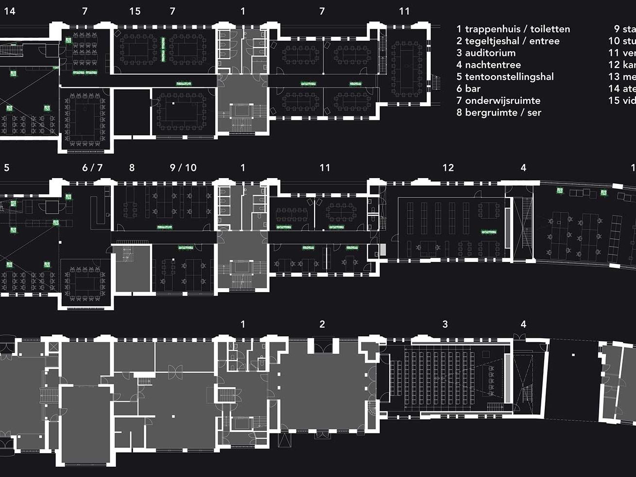 De generieke programma’s zoals onderwijs- en kantoorruimten zijn uitgevoerd in parelwit en worden opgespannen tussen de twee specifieke publieke ruimten die in chocoladebruin zijn uitgevoerd; de tentoonstellingshal en het auditorium, die daarmee een voelbare kop en staart vormen in het plan. Wisselende kleurcombinaties in bruin en wit van het meubilair, die per ruimte verschillen, versterken de identiteiten van de afzonderlijke ruimten en geven verschillende sferen.