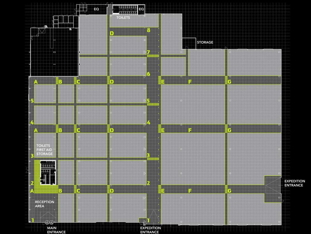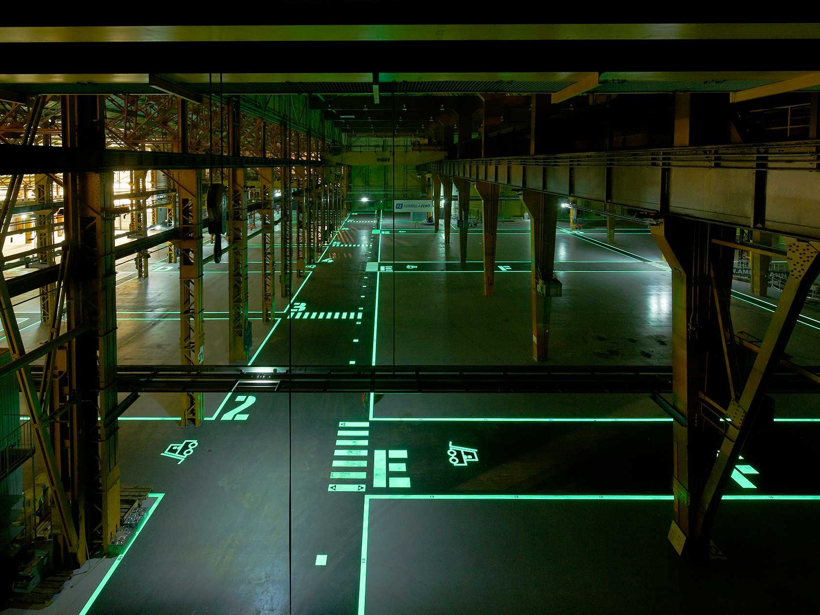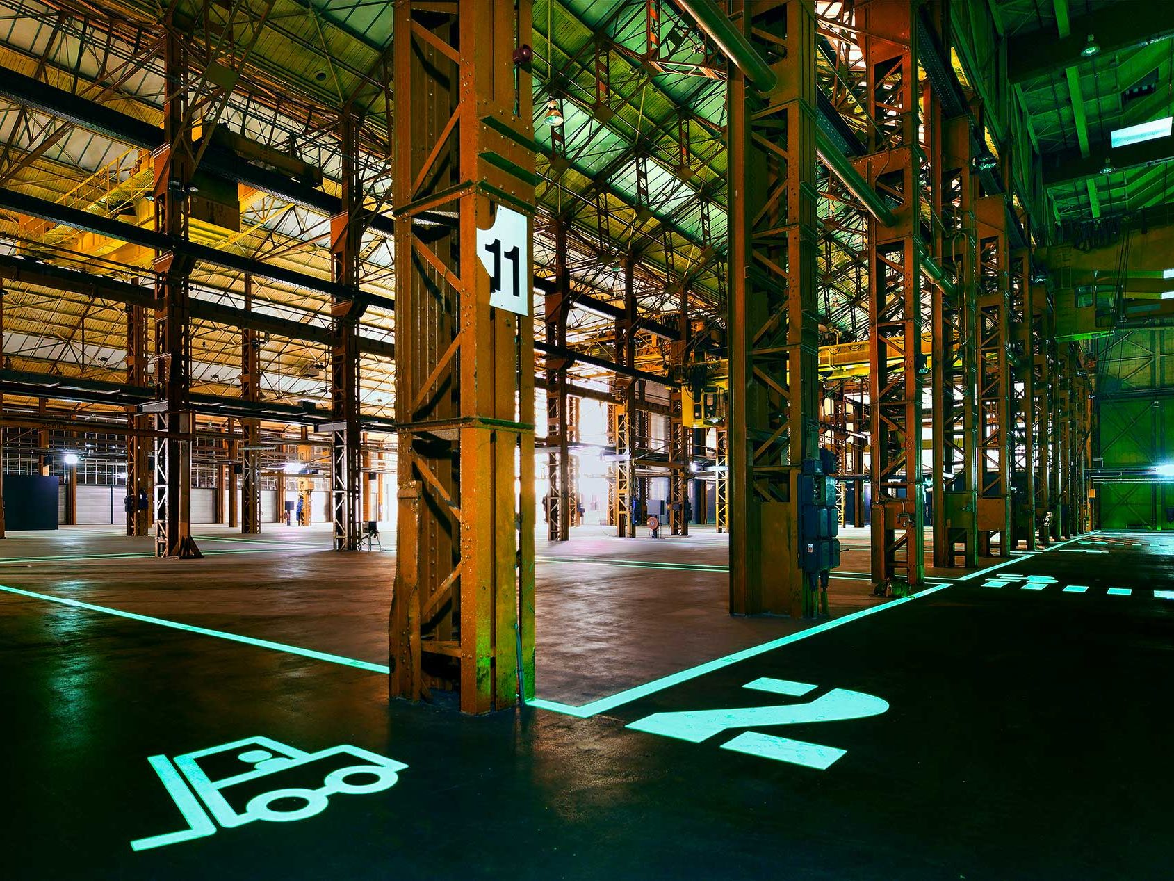 Door een integraal vormgegeven signingplan op de vloer met bewegwijzering, verkeersregels, vluchtroutes, kavelgrenzen en kavelnummering, worden het gebruik en het organisatieprincipe duidelijk verankerd.
