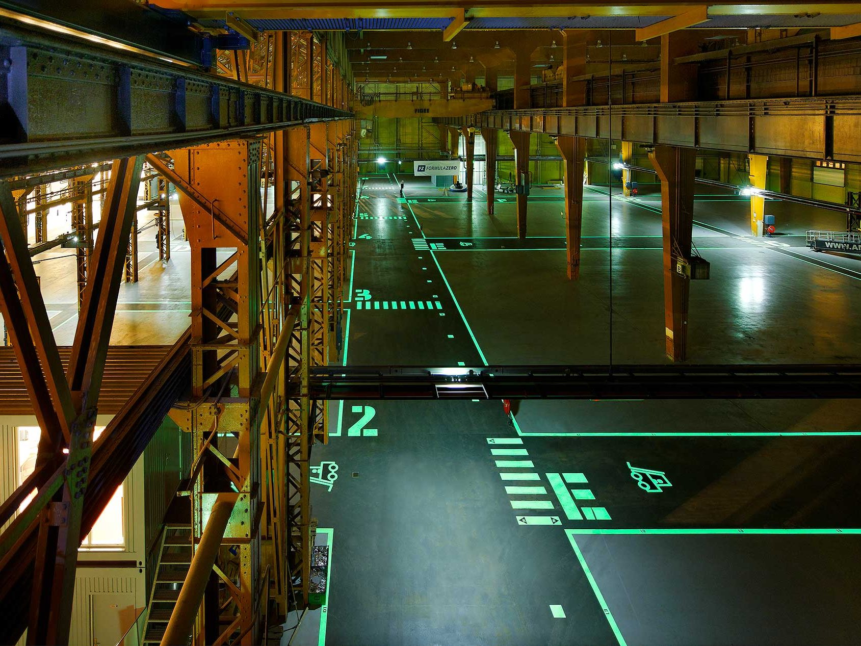 De signing wordt uitgevoerd in een ‘glow-in-the-dark’ coating, die de hal zowel overdag als ‘s avonds leesbaar maakt. De signing is overdag geel en gloeit groen op zodra het donker wordt. Dit levert een enorme energiebesparing op. De luminiscerende coating laadt zichzelf op onder invloed van zowel dag- als kunstlicht, en levert daarmee een bijdrage aan de reductie van CO2-uitstoot.