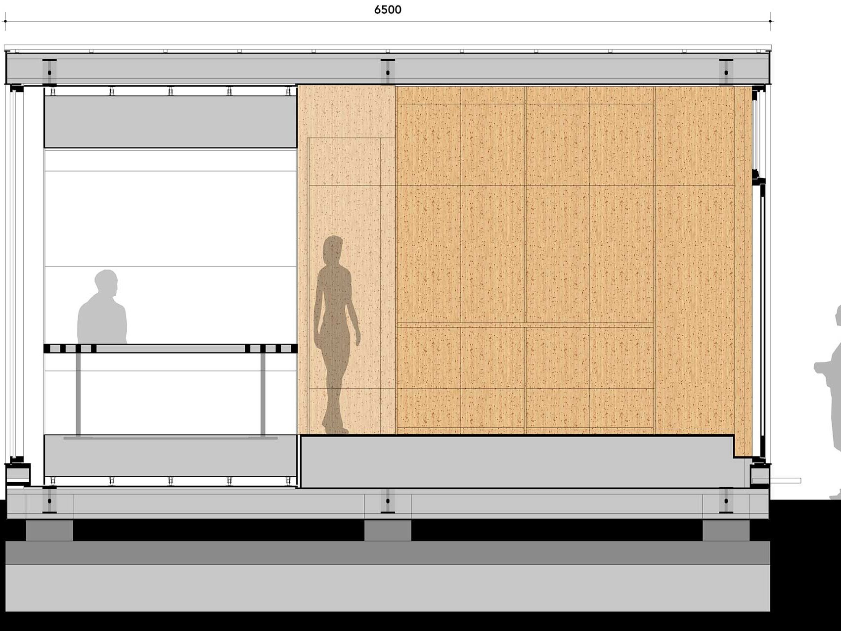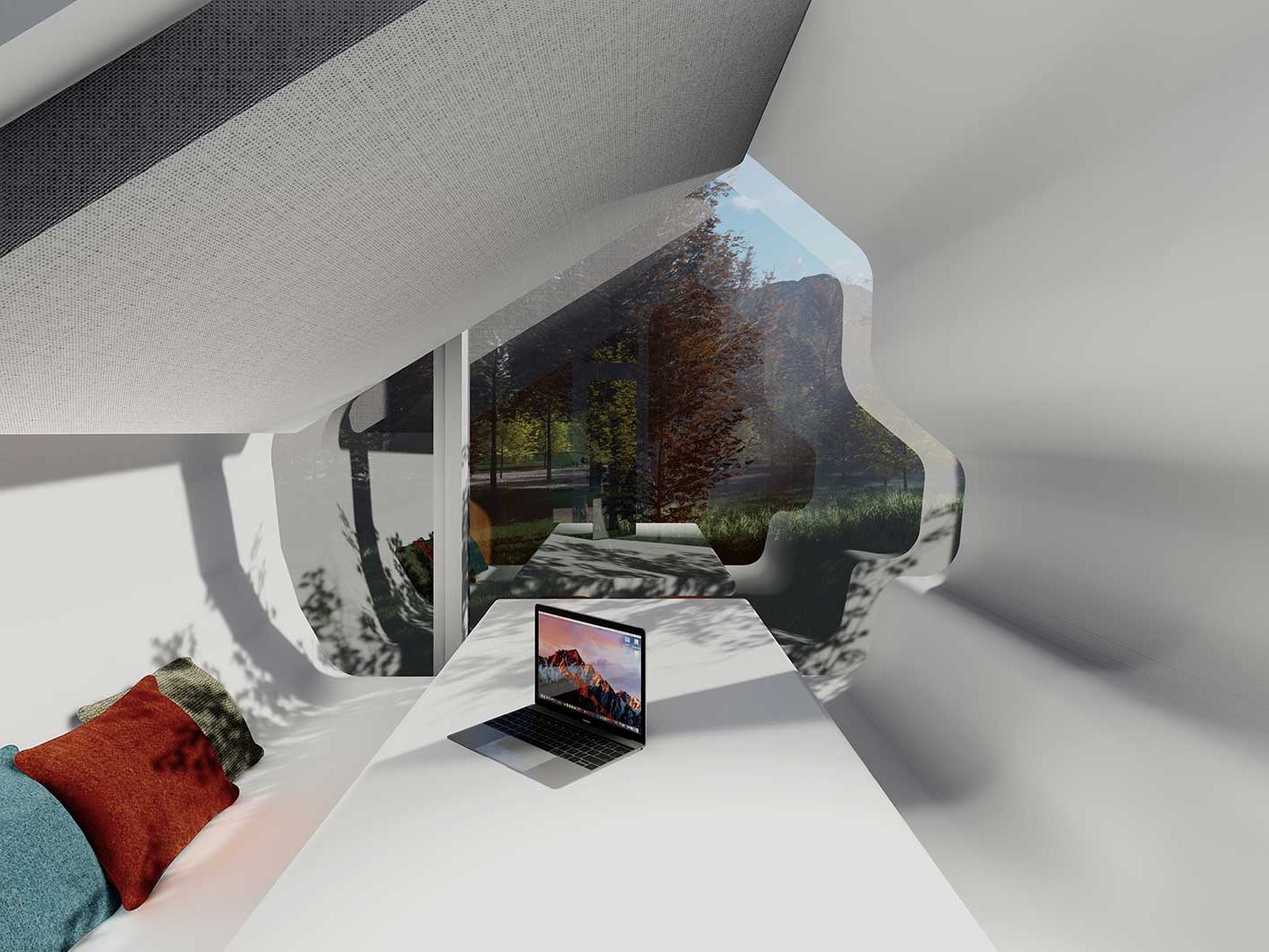 In het vaste deel van de woning bevinden zich de keuken en het sanitaire gedeelte, bestaande uit een toilet, een douche en een wastafel. Het roterende deel van de woning wordt gevormd door een kamer die in drie verschillende standen drie verschillende functies kan faciliteren. De functies van eten, werken, relaxen en slapen vloeien letterlijk in elkaar over.