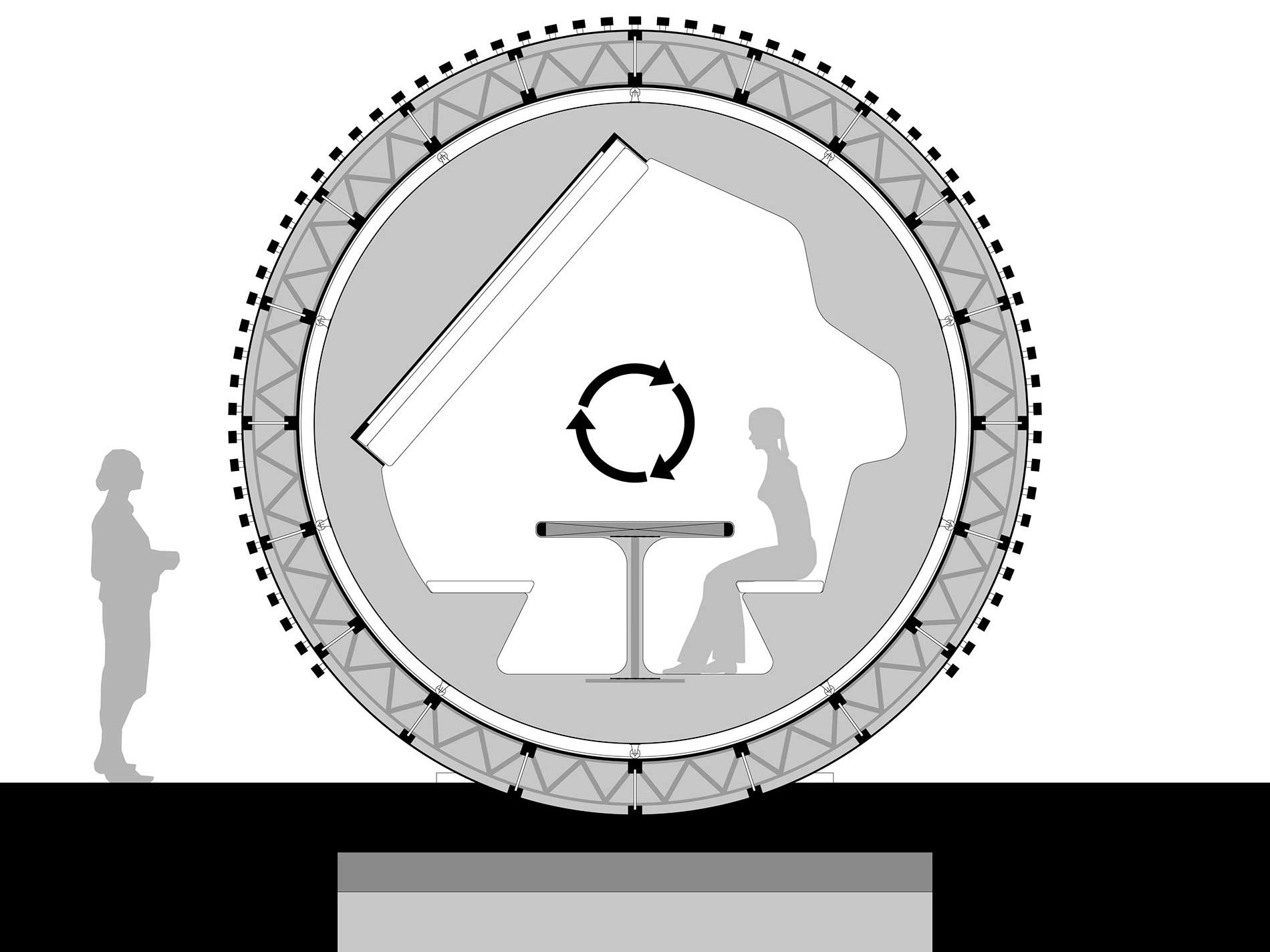 Het Tiny Revolver House is een cilindervormige woning bedoeld voor maximaal twee personen. De woning bestaat uit twee delen, een vast deel en een roterend deel.