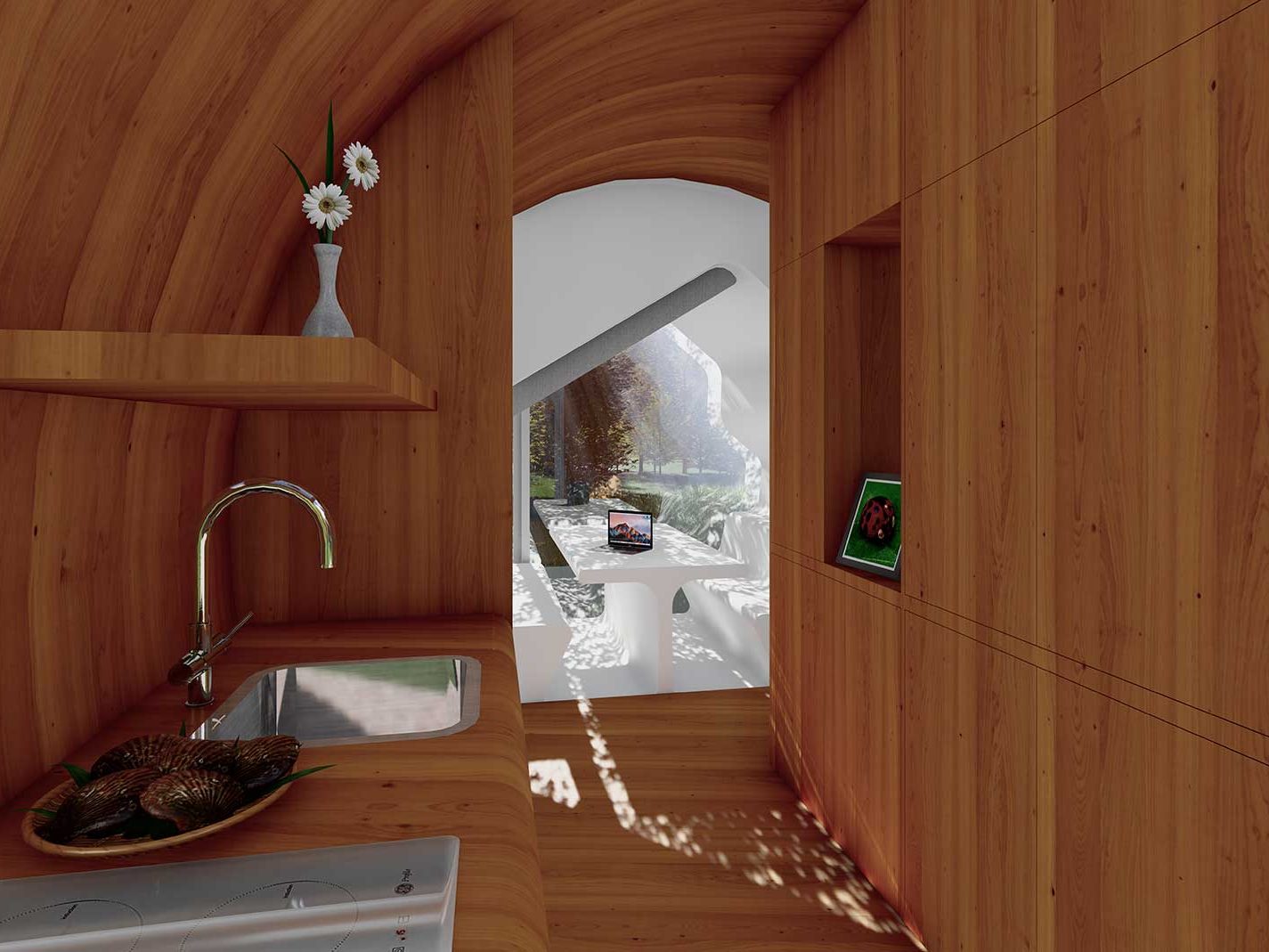 Echter, vanwege de minimale afmetingen en de vorm voegt deze woning zich als vanzelfsprekend in elke locatie en kan deze overal ‘neergelegd’ worden in de stad of op het platteland, tijdelijk of permanent. Op de kleine, soms vergeten, stukken groen, de groene randen, de oevers van de rivier, ergens in het park of in de Hortus Botanicus.