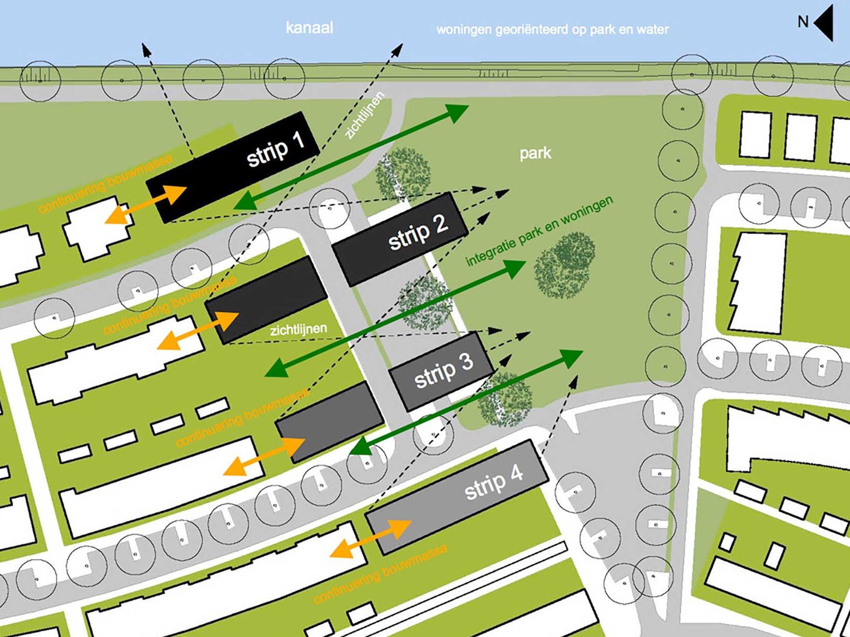 Door de stroken bebouwing richting het park minder massief te maken d.m.v. overstekken en transparantie in de gevels gaan bebouwing en park een onderlinge relatie aan.